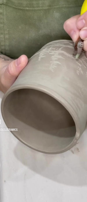 For example; Each mug is hand formed from flat slabs of clay that I roll out on a giant piece of equipment called a slab roller. then each slab must be compress, measure and cut the clay into the dimensions I need. Clay moves through various stages of drying that have descriptive names like, suede, soft leather, hard leather & bone dry. I have to wait for it to be the right consistency/dryness to start building and, joining the clay together. Too soft and it just deforms and smooshes, making everything more difficult, too hard/dry and the clay cracks. Hand buildng creates seams that I could smooth down making it appear seamless but I love the seams, it accentuates their handmade beauty.
